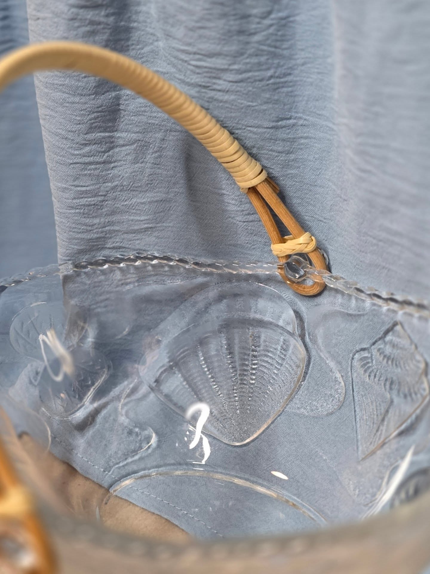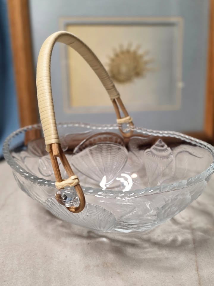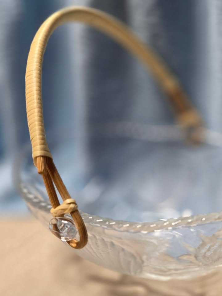 Its rattan-wrapped handle adds a warm, organic contrast to the glass, creating a balanced blend of seaside charm and mid-century sophistication.The handle is also fully removable, making the piece versatile for display or serving. It works wonderfully as a small fruit bowl, centerpiece, or catchall for jewelry or trinkets.