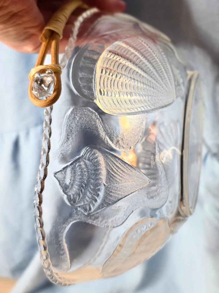 This elegant oval-shaped glass dish by Aderia features beautifully raised seashell motifs that catch the light with every angle. The clear pressed glass showcases intricate coastal detailing — from scallop shells to conch patterns — making it a charming accent for a beach house, summer table setting, or vintage glassware collection.