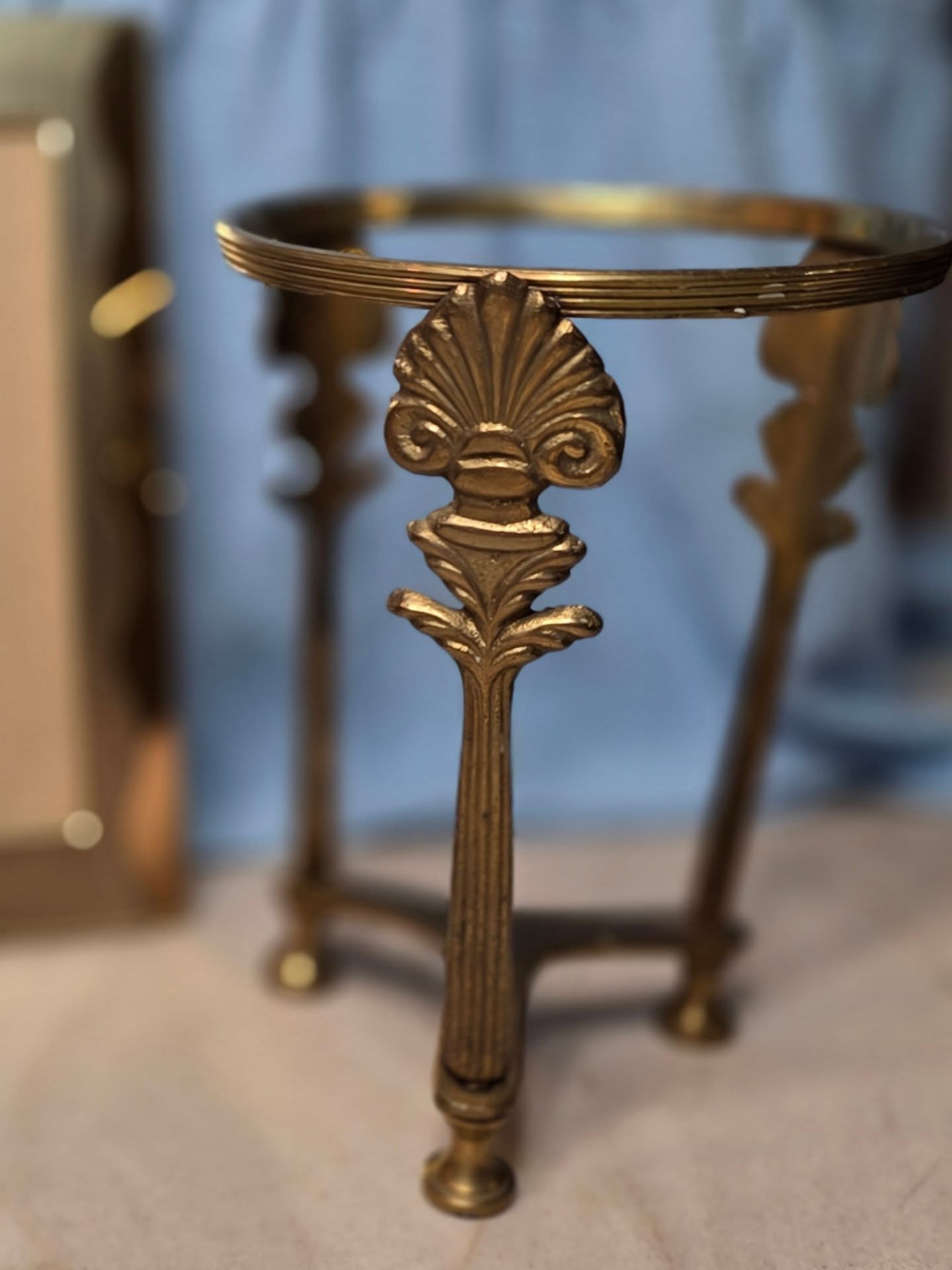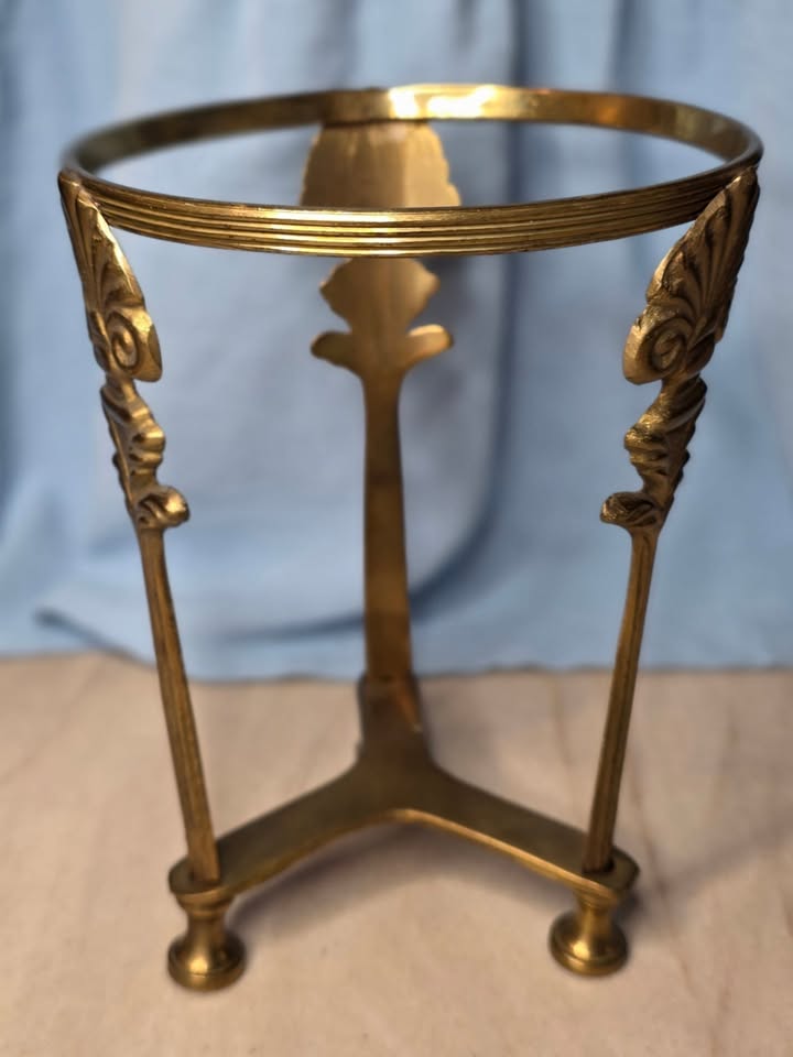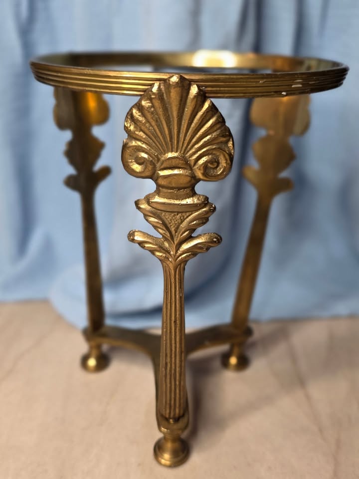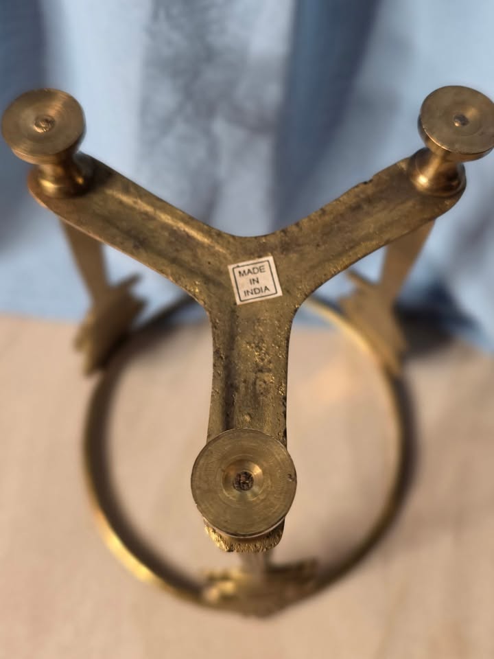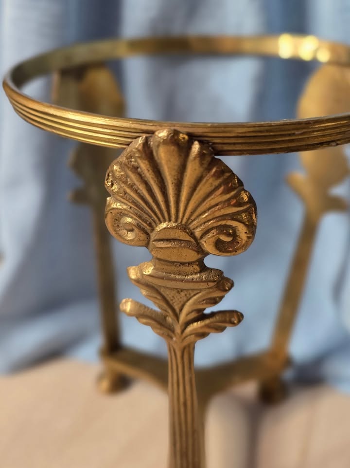 This elegant brass stand features a raised shell filigree motif with detailed scrollwork and a classic coastal flair. Crafted from solid brass with a warm, golden finish, its tri-leg design offers both beauty and balance. The piece reflects the timeless craftsmanship typical of mid-to-late 20th century Indian brass decor, known for its intricate detailing and durability.