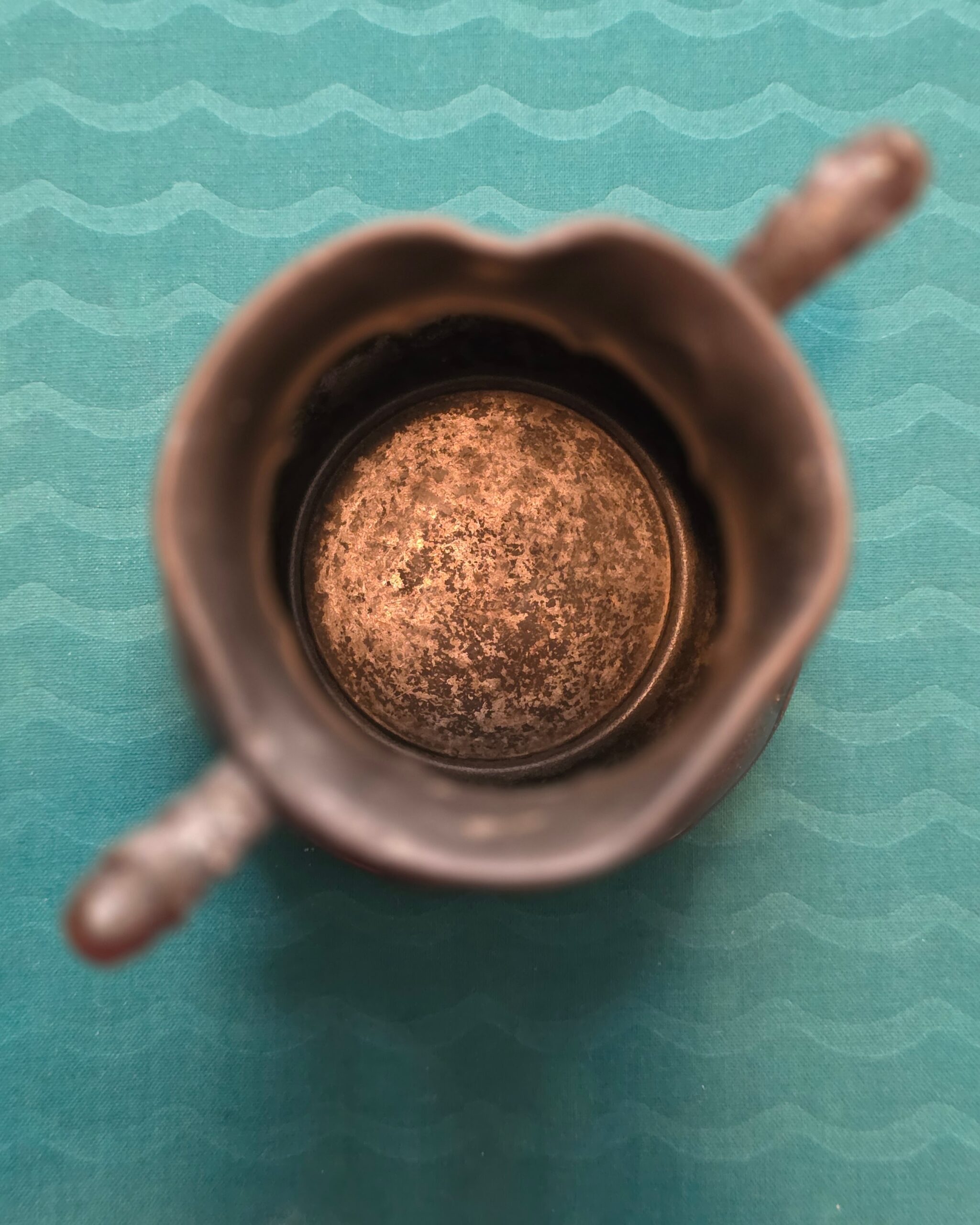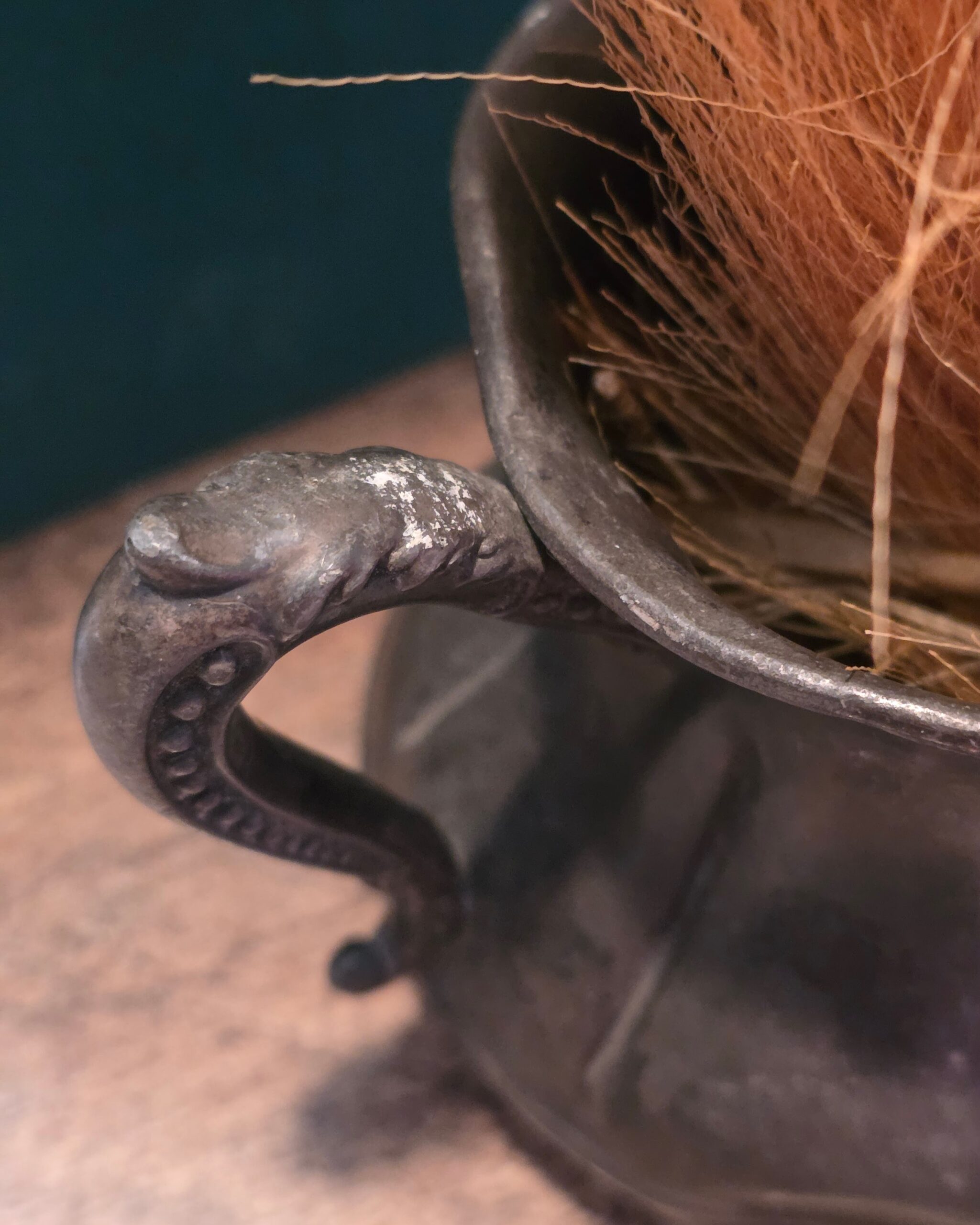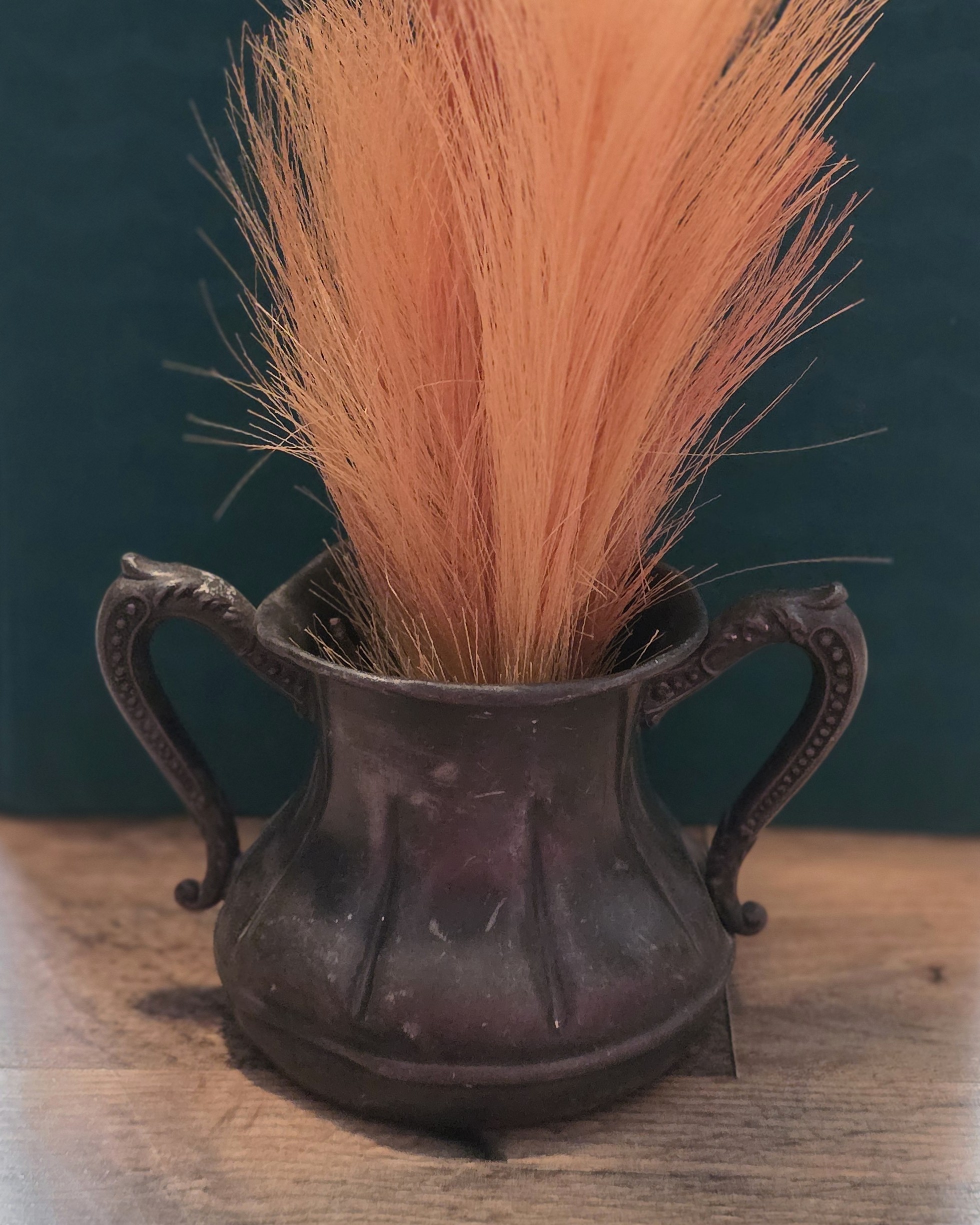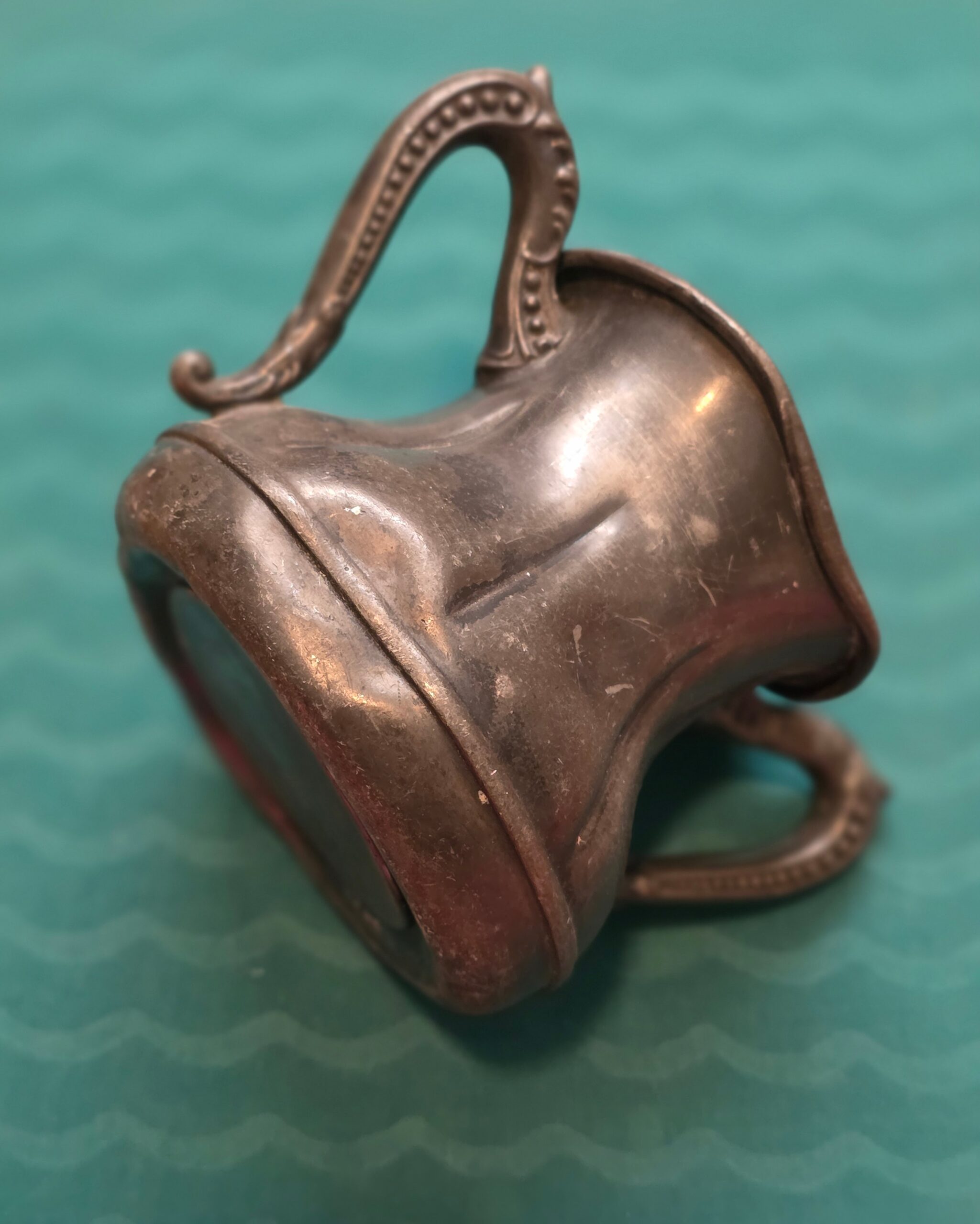 Heavily distressed with noticeable dents and significant plate loss, this piece is best suited for decorative use only. It makes a striking styling accent for shelves, dried florals, or layered vintage displays, where its honest wear adds depth and character.