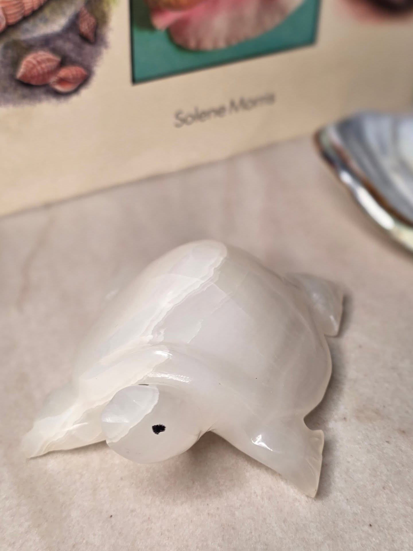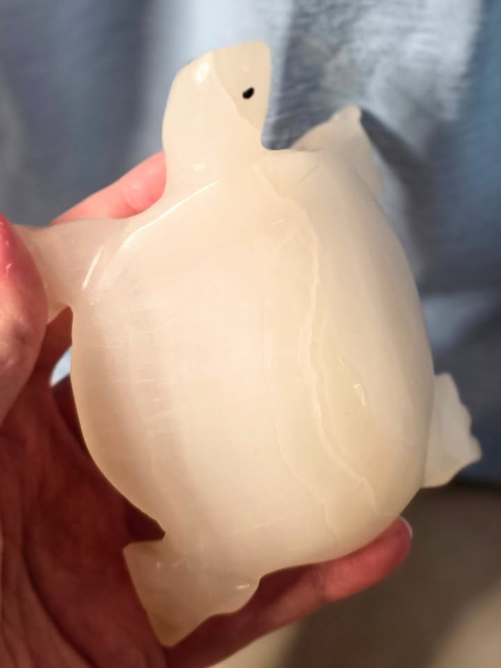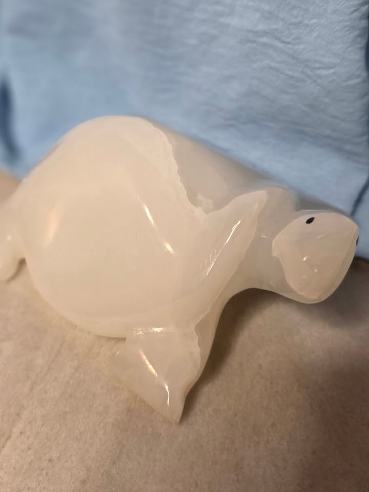 A beautifully hand-carved turtle figurine made of natural white onyx stone from Pakistan. The piece features soft, translucent veining and a polished finish that highlights the stone’s subtle banding. Both decorative and functional, it can be used as a small paperweight, shelf accent, or symbolic good-luck charm.
