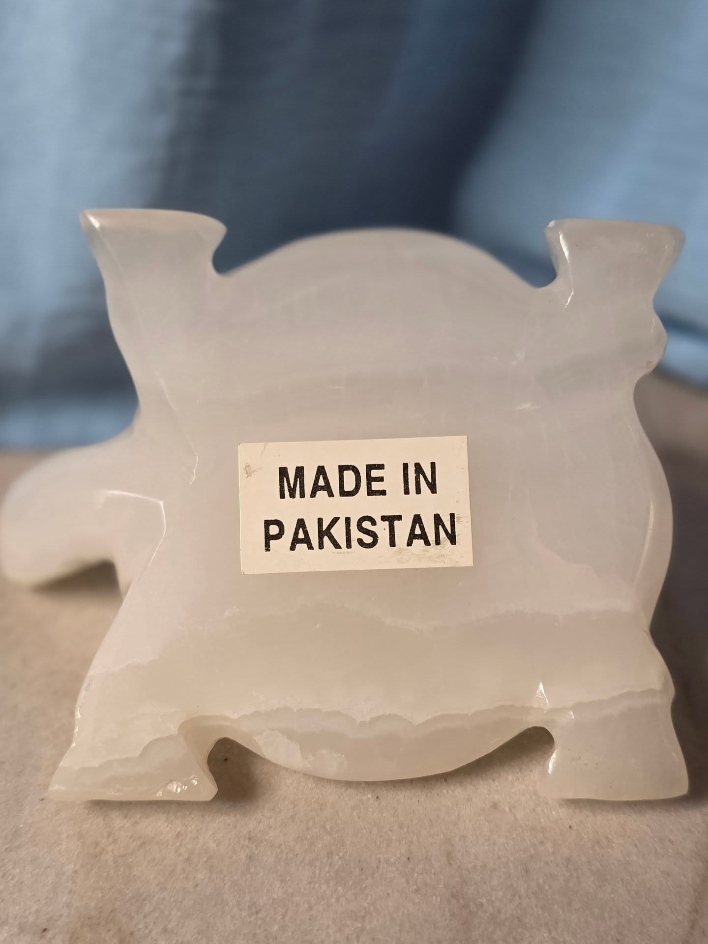 This piece reflects the craftsmanship of Pakistani stone artisans, who have been known for their onyx and marble carving since the mid-20th century. Likely produced in the 1980s–1990s, it carries the original Made in Pakistan label on the underside.