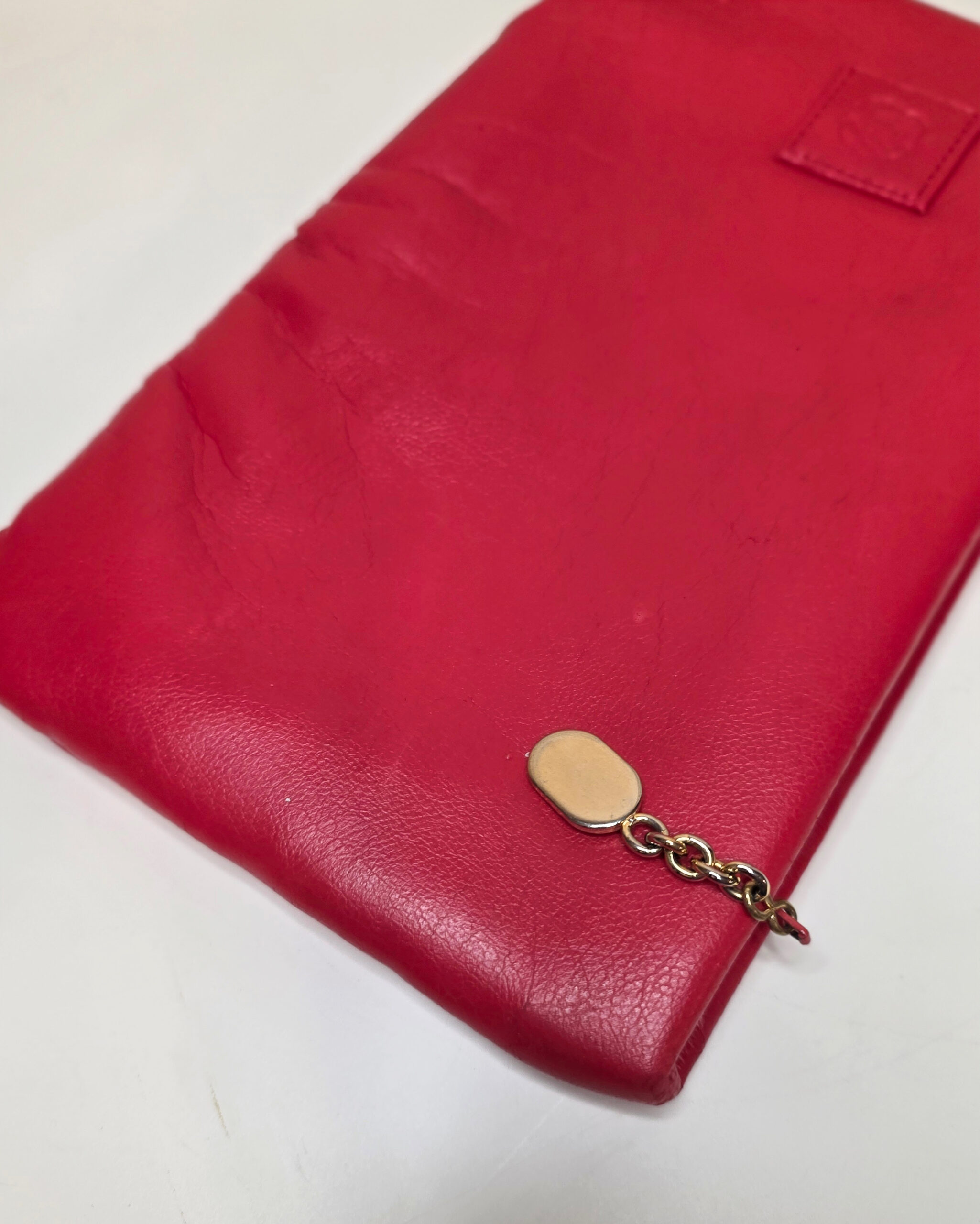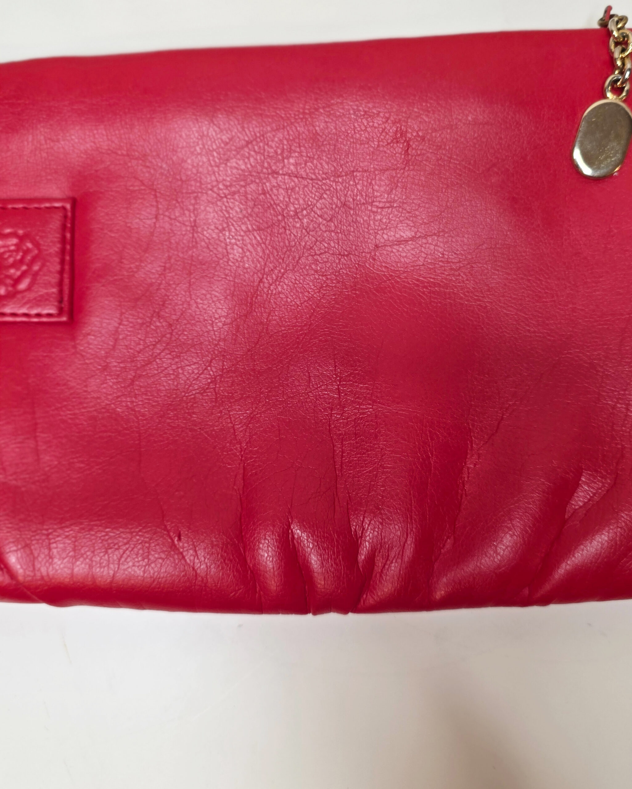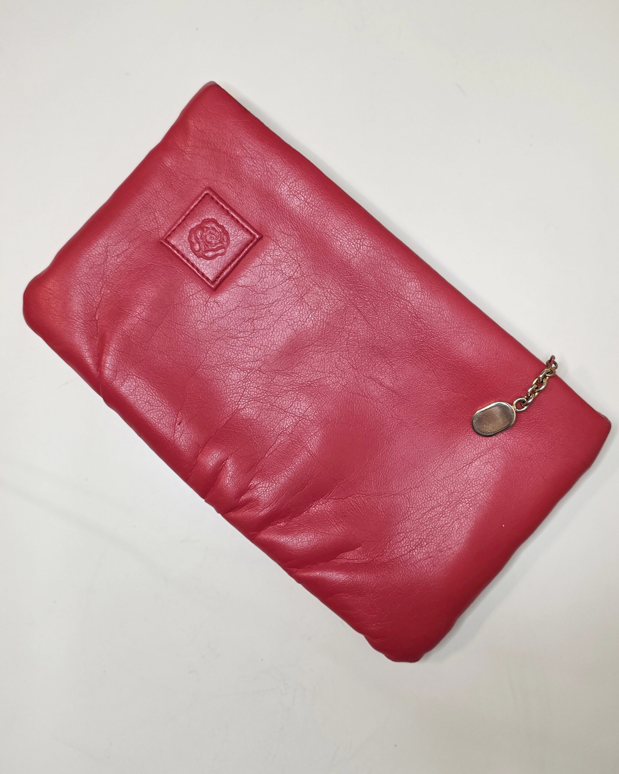 This vibrant red faux leather clutch offers classic vintage appeal with a touch of sophistication. Its smooth exterior features a stitched rose emblem and a gold chain zipper pull for subtle elegance. Despite minor signs of age, this late 20th-century design clutch remains in excellent condition, with clean stitching and a functional zipper. Perfect for adding a pop of color to any outfit — whether as a chic accessory for adults or a fun dress-up piece for young collectors.